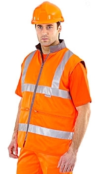 Hi Vis Rail Reversible Bodywarmer conforming to ENV471 Class 2. Reversible Bodywarmer made from polyester. Reflective tape on orange side conforms to EN471, class 2